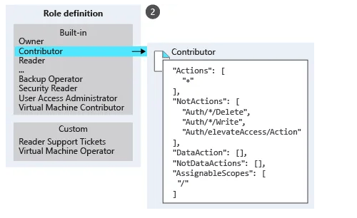 A role definition is a collection of permissions. It’s sometimes just called a role. A role definition lists the permissions that can be performed, such as read, write, and delete. Roles can be high-level, like Owner, or specific, like Virtual Machine Contributor.