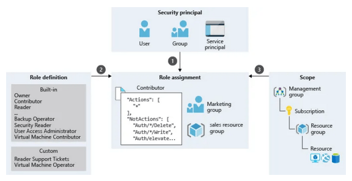 You control access to resources using RBAC by creating role assignments, which control how permissions are enforced. To create a role assignment, you need three elements: a security principal, a role definition, and a scope. You can think of these elements as “who”, “what”, and “where”.