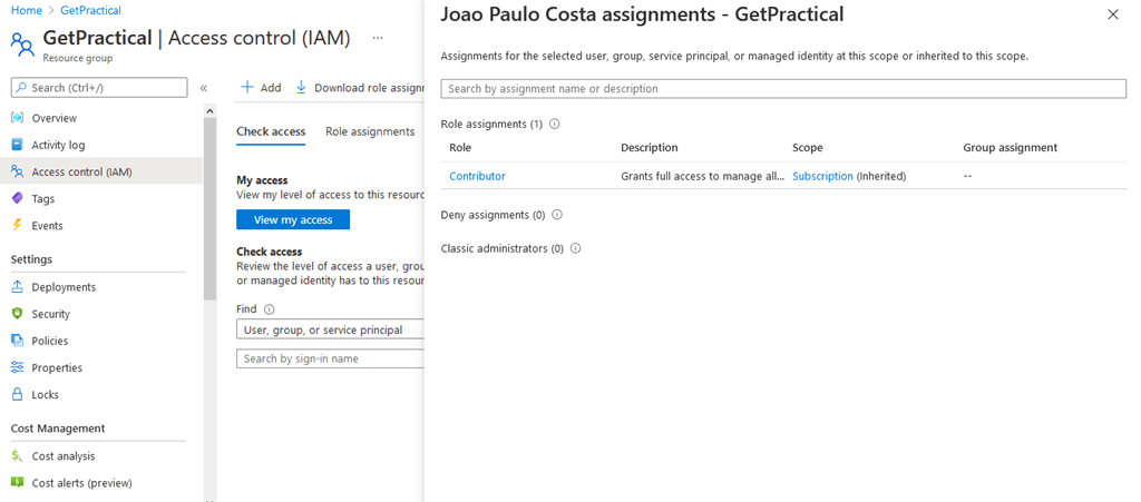 The following shows an example of the Access control (IAM) pane for a resource group. In this example, has been assigned the Contributor role to myself for the GetPractical resource group.