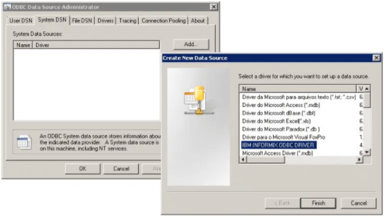• You see now a list of available data sources. Select IBM INFORMIX ODBC DRIVER. Click Finish.
