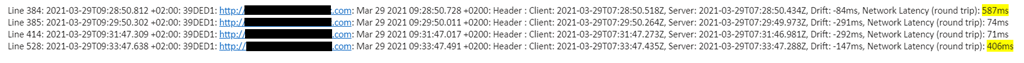 Line 384: 2021-03-29T09:28:50.812 +02:00: 39DED1: <a href="http://<http://<<uccx_server>&gt;: Mar 29 2021 09:28:50.728 +0200: Header : Client: 2021-03-29T07:28:50.518Z, Server: 2021-03-29T07:28:50.434Z, Drift: -84ms, Network Latency (round trip): 587ms