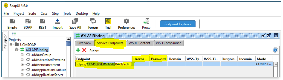 • You’ll notice the Endpoint is set to https://CCMSERVERNAME:8443/axl/ (with blank username and password)