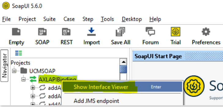 • In SoapUI, in the Navigator pane on the left, you’ll see the new project folder named UCMSOAP and the AXLAPIBinding object. Right-click on the AXLAPIBinding and click Show Interface Viewer (same as double-clicking or pressing Enter).