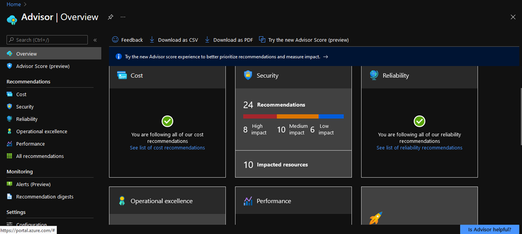 The Advisor dashboard displays personalized recommendations for all your subscriptions. You can apply filters to display recommendations for specific subscriptions and resource types. The recommendations are divided into five categories: