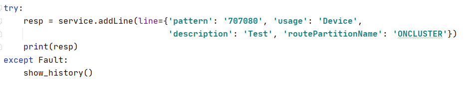 resp = service.addLine(line={‘pattern’: ‘707080’, ‘usage’: ‘Device’,