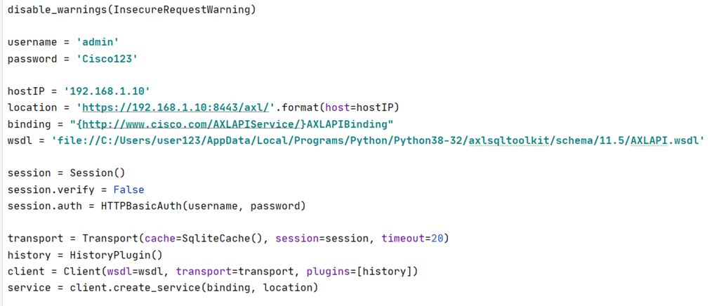 wsdl = ‘file://C:/Users/user123/AppData/Local/Programs/Python/Python38-32/axlsqltoolkit/schema/11.5/AXLAPI.wsdl’