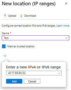 As a first step I suggest that you add the trusted locations (Named Locations), that is, known networks. Click on Named Locations and then select one of the options; 1- Countries Locations or 2 – IP Ranges Locations. I opted for option 2 and added the IP/IP Ranges of my trusted locations.