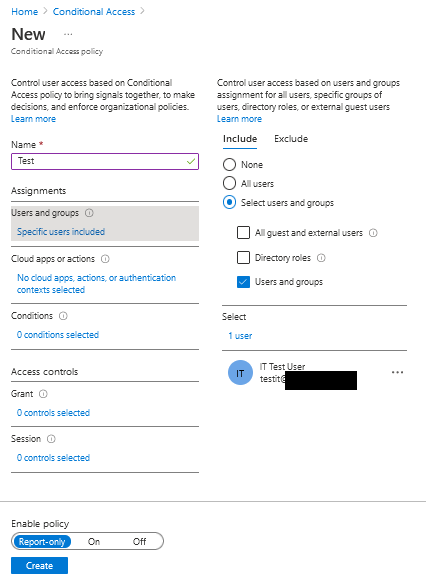 Name your policy and choose the user context that will be included or excluded from your policy. In my scenario, I just selected the Test IT user to be included in this policy.