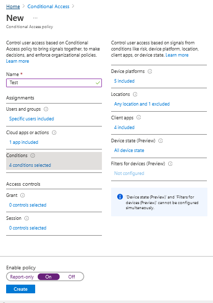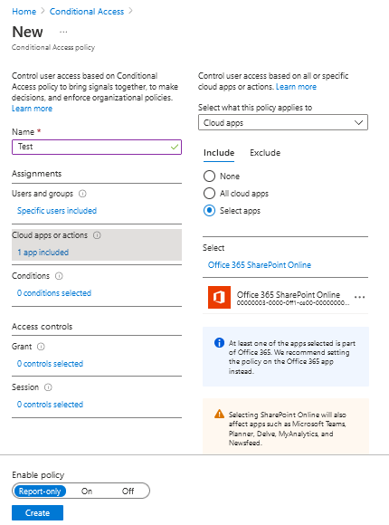 Basically you will need to create a rule that says, for example, that all users who are outside your physical working environment (Does this still exist?) and who have devices provided by the company and Multi-factor authentication enabled will be able to access Sharepoint. You can choose if you only want to register this information (Report-Only) or if you really want to deny/grant access if the user does not comply with the rules you stipulated above.