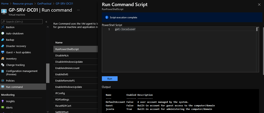 Starting with the user, in case you don’t remember, it’s a pretty simple task to find out: Go to Azure and make sure your VM is powered on, then select your VM and go to blade “Operations” and select “Run Command” and finally click on “RunPowerShellScript”. This will cause a dialog box to open and in this box you will type the following command in: “Get-LocalUser” and click “Run”.