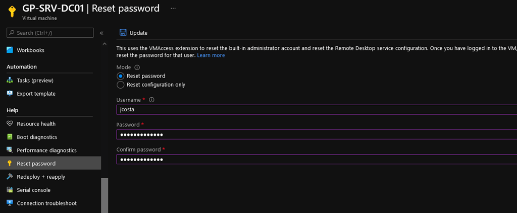 The easiest and simplest option would be again with your VM selected, go to the blade “Help” and click on “Reset Password”. You will only need to enter the user you want to reset the password and your new password.