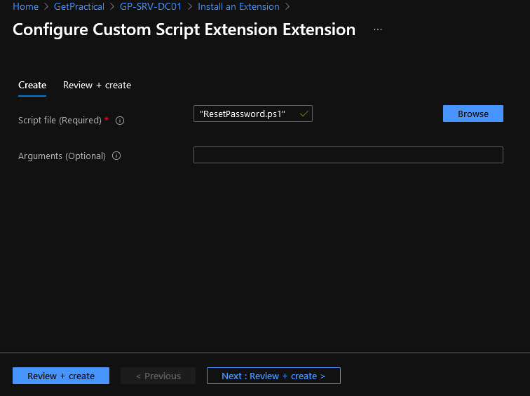 After creating the script, saving as ResetPassword.ps1 and uploading it to a storage account on azure, select your VM again and in the blade Settings click on Extensions > Add > CustomScriptExtension > Next > RESETPASSWORD.PS1 > Review + Create > Create.
