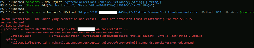 $response = Invoke-RestMethod https://<<EXPRESSWAY>>:445/api/v1/status/common/fail2banbannedaddress’ -Method ‘GET’ –Headers $headers