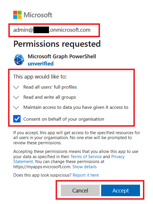 The scope here is important so that at the time of invoking the command you can receive the prompt to grant permission to access the Graph API through the PS. You can read more about this here.