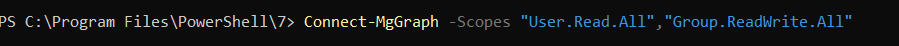 Connect-MgGraph -Scopes “User.Read.All”,”Group.ReadWrite.All”