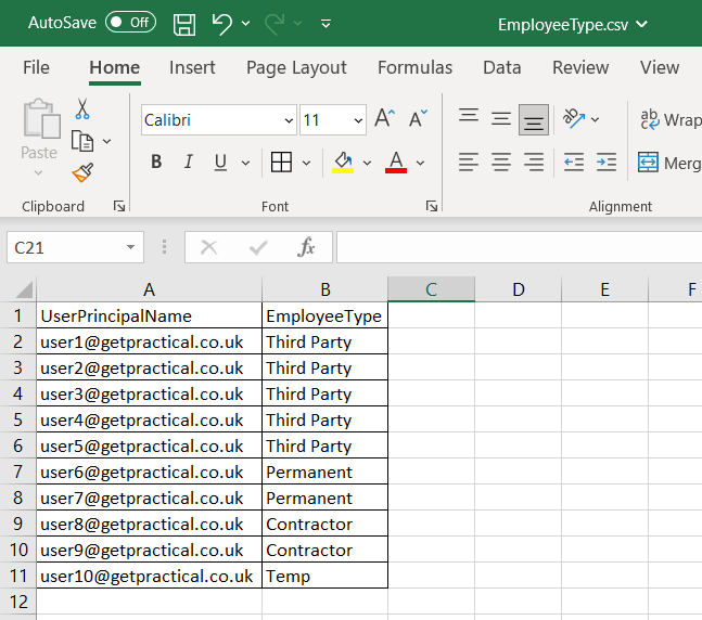 I’ll show you how to change the EmployeeType in Bulk Mode, and as an example I’ve created the following CSV (Comma Separated Value) file. The important thing is that in the command you use the variables exactly as in the header of each column of the CSV file.