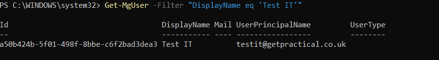 Get-MgUser -Filter “DisplayName eq ‘Test IT'”