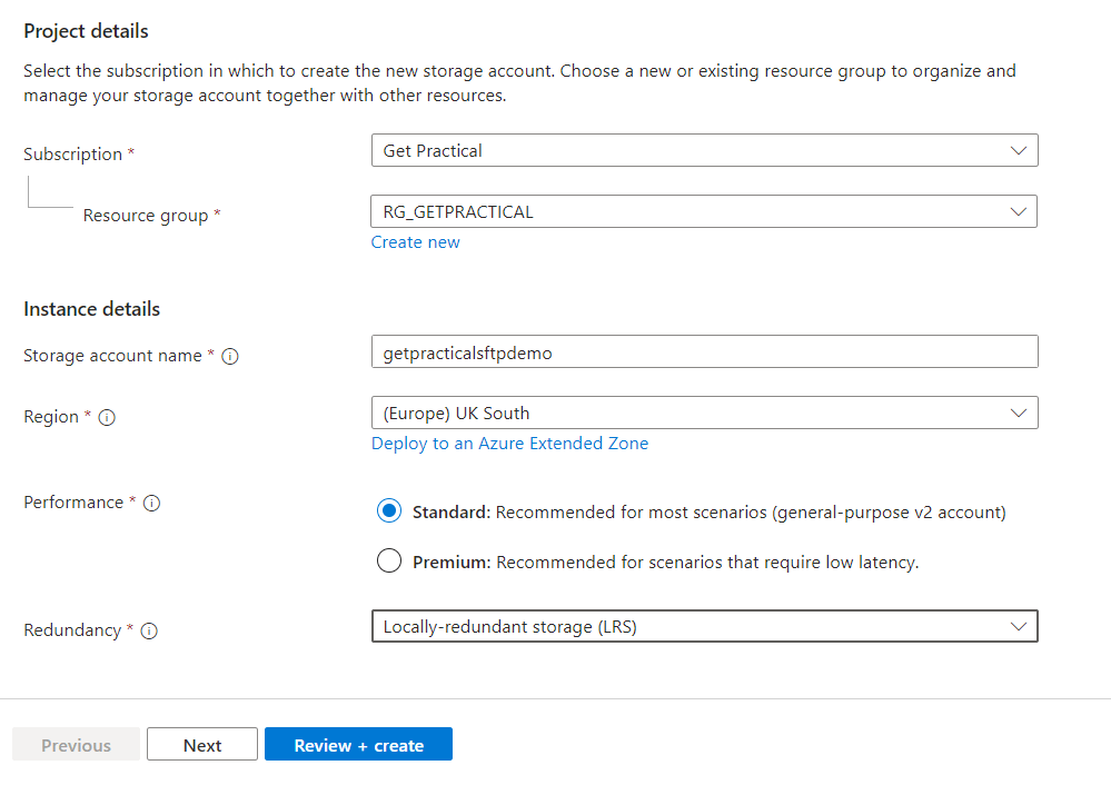 - Redundancy: Choose the redundancy option that fits your needs (e.g., Locally-redundant storage (LRS)).
