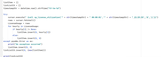 Then, use Python to manipulate the results according to your needs. In my case, I’m using the datetime to get today’s date. I also created a list to save the values, as this code will check the license each hour, and give me the maximum as a final result.